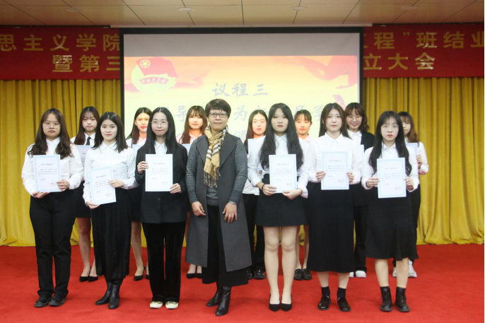 在庄严肃穆的团歌中,成立大会拉开了帷幕。辅导员郭德厚老师宣读了马克思主义学院第三届团学组织干部名单,杨倩副书记为新一届学生干部颁发了聘书,并对新一任“两会”干部提出希望:要树立服务意识,明确使命,提升自身能力,在工作中不断创新。