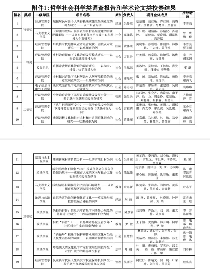 据悉,“挑战杯”全国大学生课外学术科技作品竞赛由共青团中央、中国科协、教育部、全国学联和地方省级人民政府共同主办,这项被誉为中国当代大学生科技创新的“奥林匹克”盛会正走向全国,走进青年,走在时代前列。本次竞赛共有142所高校3636件作品参加竞逐,创历史新高。马院学生团队在参加本届“挑战杯”比赛之余,还参与广东省2021年“攀登计划”,成功将本项目提升为“哲学社会科学类立项重点资金资助项目”。此外,该项目还在惠州学院第四届“挑战杯”比赛中荣获特等奖。