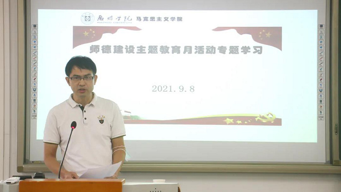 刘国远宣读了2020年—2021年学院教师的获奖情况,对我院教师取得的成绩表示肯定,鼓励我院教师向获奖教师学习。接着,刘国远领学了《广东省教育厅关于开展2021年师德建设主题教育月活动的通知》,并结合近期教育部公开曝光的违反教师职业行为十项准则典型案例及个别老师课堂不雅言论的案例,以案警示,强调师德建设是教师队伍建设的第一要务,师德师风是评价教师队伍的第一标准,希望全体教师按习近平总书记提出的“四有好老师”、思政课教师“六要”素养标准的严格要求。刘国远还结合教育部办公厅印发的《关于学习宣传贯彻实施新修订的教育法的通知》,带领全体教师学习了新修订的《中华人民共和国教育法》的相关内容和精神,深入了解加强党对教育事业的领导的历史与现实意义,了解党的教育方针的历史演变,深刻领悟将习近平新时代中国特色社会主义思想作为教育指导思想是新时代教育发展的必然要求。最后,刘国远对新学期开学疫情防控工作进行了再布置、再强调,要求充分发挥基层党组织和党员先锋模范作用,毫不放松,做好疫情防控工作。