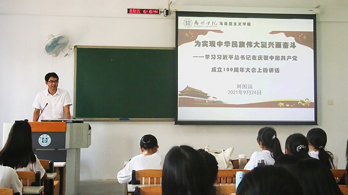 9月24日下午,我院党总支书记刘国远在旭日楼203教室为我院2020级全体学生开展题为《为实现中华民族伟大复兴而奋斗---学习习近平总书记在庆祝中国共产党成立100周年大会上的讲话》的“思政第一课”,专题学习习近平总书记在庆祝中国共产党成立100周年大会上的重要讲话精神。学校教学督导成员关威教授受邀参加指导。