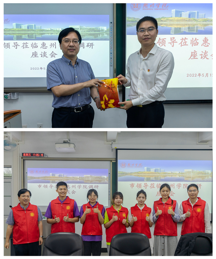 本网讯 5月13日下午,惠州市委常委、宣传部部长黄细花,市委宣传部直属机关党委书记刘益明等一行来校调研,就意识形态工作、青年思想政治教育、思政课建设以及志愿服务等工作进行调研座谈。“中国青年五四奖章”获得者、共青团兰州市委副书记张森应邀作主题分享。我校党委副书记车小真及有关部门、学院负责人等参加活动。