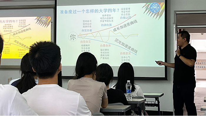 课堂伊始,张淇喆老师以“初来大学,我们最需要什么?”的话题引发同学们对如何适应大学学习和生活的思考。他结合大学的特点和生动的实例,教导同学们面对未来大学生活,要明确自身需求,认真学习专业知识,积极参与校园活动,与同学和谐相处,丰富学习生活,绘写五彩“四年”。