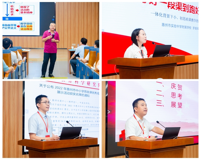 启动仪式结束后,惠州学院马克思主义学院党总支书记游少华主持开展了教研活动。华南师范大学马克思主义学院刘石成副教授应邀为参会教师作《课程目标一体化:大中小学思政课一体化的关键》主题报告。惠州市实验附属学校道德与法治教师、科组长罗美玲,大亚湾区教育文化卫生健康局政治教研员廖剑辉,惠州城市职业学院马克思主义学院党支部副书记、副院长彭敏分别代表小学、中学、大中专学校,围绕大中小学思政课一体化建设作了发言。