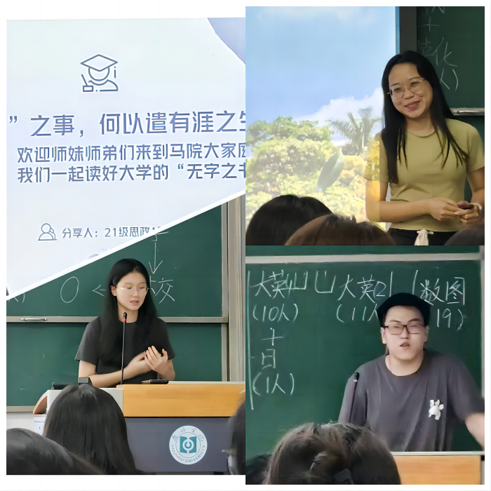 2022级的黄筠瑶用“新苦”“心苦”“辛苦”等三个“苦”介绍了她的大学生活,鼓励新生们把握试错机会,积极参加竞赛,明确发展方向。2021级的刘菁茹以“大学期间的社会实践项目——读好大学的‘无字之书’”为主题,结合个人实践经历,阐述了积极参与社会实践的重要意义和践行方式。