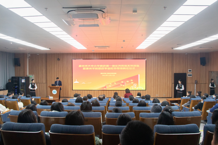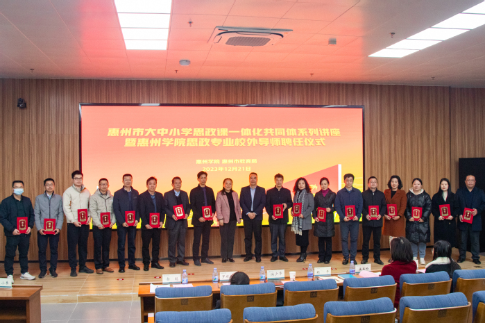 12月21日下午,我校在旭日科技大楼A座302会议厅举行惠州市大中小学思政课一体化共同体系列讲座暨惠州学院思政专业校外导师聘任仪式。惠州市教育局及惠州学院有关职能部门领导,惠州市大中小学思政课一体化共同体及思政课教师联盟成员,马克思主义学院思政专业校外导师、师生代表等共300余人参加会议。