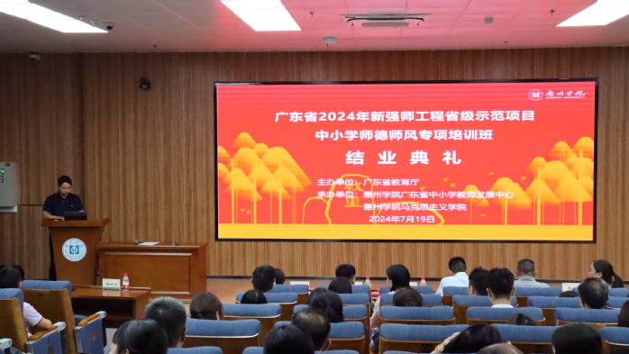 7月19日下午,培训班结业典礼在惠州学院科技大楼A座302会议厅举行,惠州学院继续教育学院、马克思主义学院领导出席结业典礼。学员代表做了培训小结汇报,分享了专业知识与技能的提升,强调了师德师风的重要性,承诺将以高尚师德师风引领学子,共绘教育新篇章。