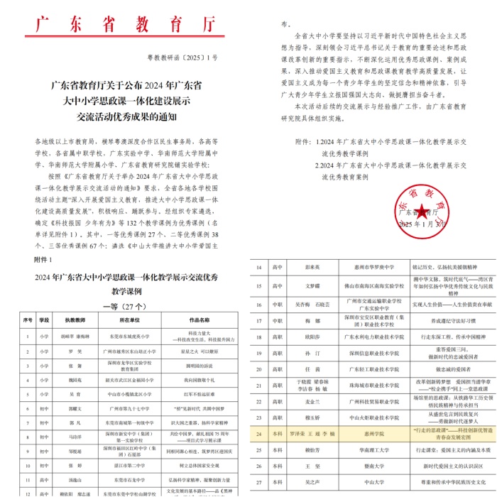近日,省教育厅印发了《广东省教育厅关于公布2024年广东省大中小学思政课一体化建设展示交流活动优秀成果的通知》,活动共评出一等优秀课例27个、二等优秀课例38个、三等优秀课例67个。我校马克思主义学院罗泽荣、王瑶、李楠老师课程组录制的教学课例《“行走的思政课”——科技创新优智造 青春奋发展宏图》在本次活动中荣获一等奖,位居本科高校第一名(全省一等奖本科高校仅4名)。