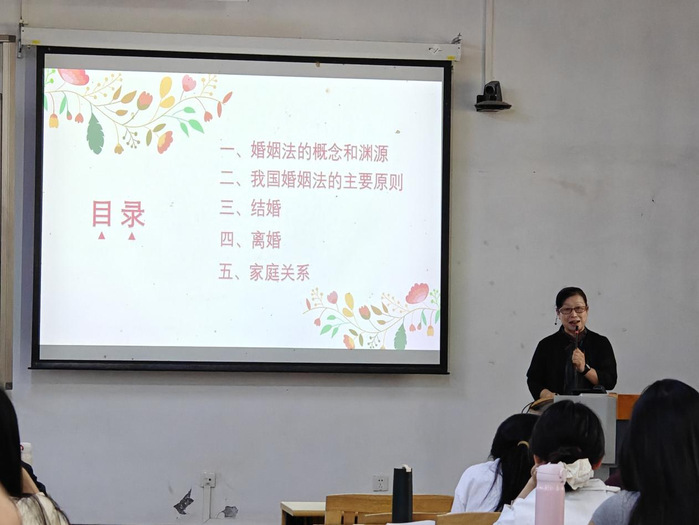 课程开场,李珍老师凭借轻松幽默的话语,瞬间拉近与同学们的距离,让课堂氛围变得活跃起来。随后,她以《中华人民共和国民法典》婚姻家庭编为蓝本,结合“离婚冷静期争议”“夫妻共同财产界定纠纷”等当下社会热点案例,从婚姻的基本概念、婚姻自由等原则,再到夫妻关系、亲子关系等家庭关系层面,进行了细致入微的解读,帮助学生理解法律条文背后的深层含义与实践应用。